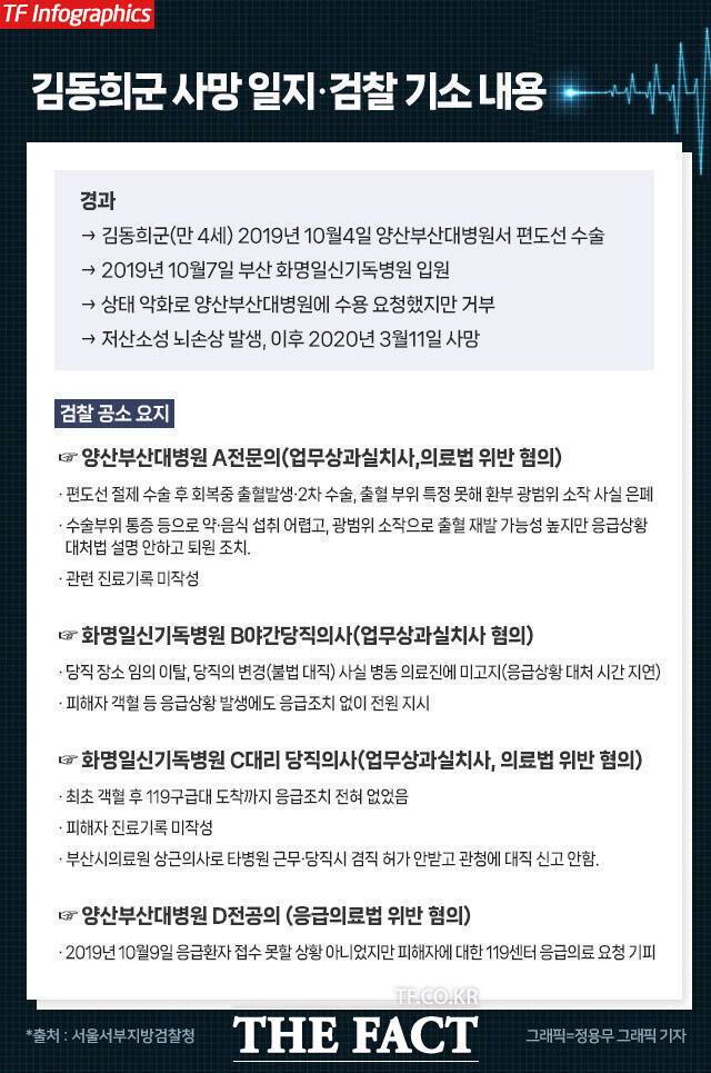 김 씨도 아들 사망 후 3년이 지나 의학박사 출신 검사가 수사에 투입돼서야 의료인 과실 혐의를 알 수 있었다. 앞서 2019년 수술을 진행한 의사가 걱정하지 말라며 퇴원 조치해 김 군은 병원을 나왔지만 상태가 나빠져 2차 병원에 입원했다. 이틀만에 심정지가 왔고 수술을 한 양산부산대병원은 수용 요청을 거부해 끝내 사망했다.