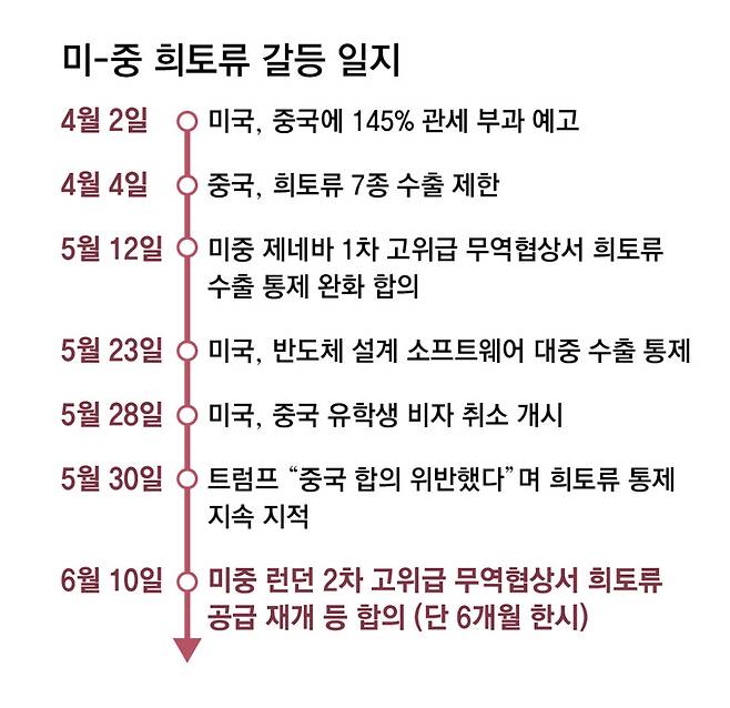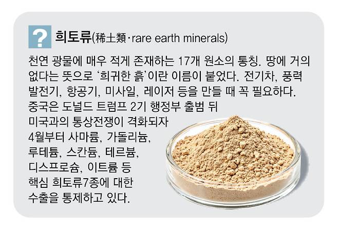 하지만 중국이 전기차 배터리, 스마트폰 등 각종 첨단 기기에 꼭 필요한 ‘핵심 희토류 7종’에 대한 수출 통제를 본격화하자 트럼프 2기 행정부의 속내가 다급해졌다. 희토류 부족으로 미국 주요 자동차 기업들이 생산에 어려움을 겪는 등 피해가 가시화됐기 때문이다.