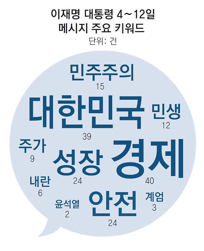 이 대통령은 취임 후 9일간 경제를 40회, 대한민국을 39회 언급한 것으로 나타났다. 이어 성장과 안전 각각 24회, 민주주의(15회), 민생(12회) 순으로 언급 빈도가 높았다. 동아일보가 이 대통령이 취임한 4일부터 이날까지 대통령실이 공식 제공한 메시지와 회의 발언(16건)을 토대로 분석한 결과다.