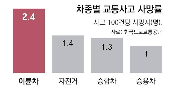 이륜차 사고는 승용차 사고보다 사망률이 높다. 한국도로교통공단에 따르면 최근 5년간 이륜차 교통사고 사망률은 2.4%였다. 사고 100건당 사망자 2.4명이 발생했다는 의미다. 이는 승용차(1.0%)의 2.4배다. 정미숙 한국도로교통공단 교육운영처 차장은 “이륜차 특성상 운전자가 외부에 노출돼 사고 시 신체 손상이 심각하다”며 “충돌 이후 이륜차가 전도되면서 운전자가 도로로 튕겨 나와 2차 사고가 발생해 사망으로 이어지는 경우가 많다”고 설명했다. 최근 5년간 이륜차 사고는 총 9만2000건 이상 발생했고 2221명이 숨졌다.