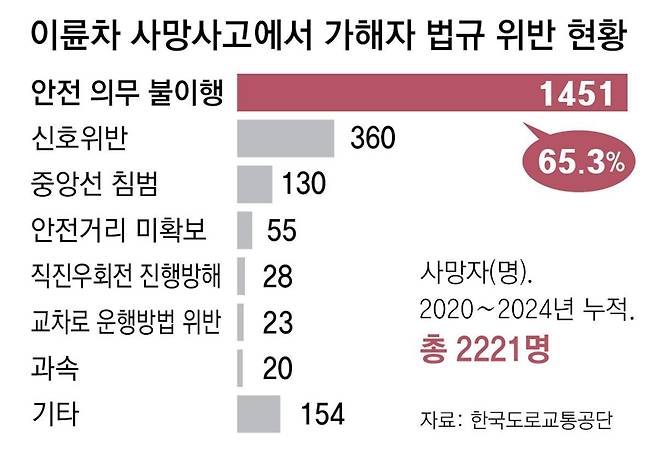 도로교통공단 통계를 보면 최근 5년간 이륜차 교통사고 중 ‘안전 의무 불이행’으로 인한 사고가 4만8262건(52.5%)으로 절반 이상이다. 전방 주시 소홀이나 운전 중 휴대전화 사용 등이 이에 해당한다. 이 외에도 신호 위반(20.6%), 안전거리 미확보(6.8%) 등이 사고의 주요 원인이었다.