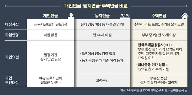 ◆ 보유 주택이 있다면 ‘주택연금’=주택연금은 주택을 담보로 제공하는 대신 해당 주택에 계속 살면서 평생 매월 연금을 받을 수 있는 제도로 국가가 보증한다. 부부 중 한명이라도 55세 이상이고, 공시가격 12억원 이하의 주택(아파트 포함) 또는 주거용 오피스텔을 보유한 경우 가입 가능하다. 최근에는 하나금융이 12억원 초과 주택을 대상으로 한 주택연금 상품을 은행권 최초로 출시하면서 고가 주택 보유자에게도 주택연금 가입의 길이 열렸다.