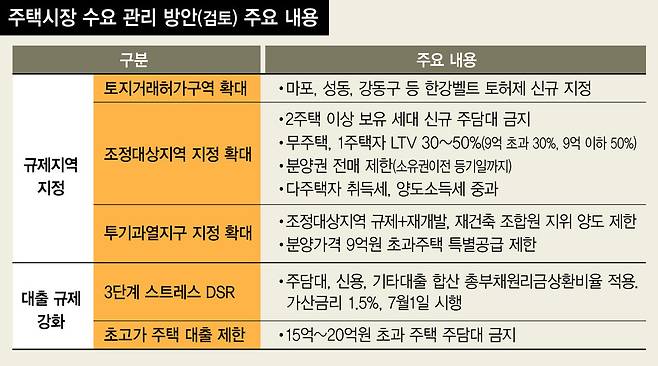 그러나 서울시의 토허제 추가 지정 여부와 관계없이 정부가 나서 투기 억제와 수요 관리에 대한 의지를 밝히는 게 필요하다는 지적이 나온다. 토허제 지정의 효과가 크지 않은 현실까지 고려해 한강벨트 등을 타깃으로 한 조정대상지역·투기과열지구 등 ‘핀셋’ 규제를 적극 검토해야 한다는 뜻이다. 2022년 윤석열 정부 들어 서울시의 규제지역은 강남3구와 용산구를 제외하고 모두 풀린 상황이다. 규제지역으로 지정되면 대출, 세금, 거래 등에서 여러 제약이 따른다. 또 규제지역과 토허제에도 끄떡없는 강남3구의 집값 안정을 위해서는 과거 문재인 정부 때인 2019년 시행했던 ‘15억원 이상 고가주택 대출 금지’ 등의 강도 높은 대출 규제를 부활하는 방안도 거론된다. 고가주택 대출 금지는 ‘국민 경제활동에 대한 과도한 제약’이라는 위헌 논란이 있었지만 2023년 3월 헌법재판소에서 ‘합헌’ 판정을 받은 바 있다. 이름을 밝히길 꺼린 한 부동산 전문가는 “이재명 정부가 세금으로 집값을 잡는 방식을 쓰지 않겠다고 공언해 고가주택·다주택 과세를 당장 손대기 어렵다면 초고강도 대출 규제를 통해서라도 집값 안정 의지를 보여야 한다”며 “13억원대인 서울 아파트 평균가격을 고려할 때 20억원 정도 이상 고가주택을 대상으로 하는 게 바람직하다”고 짚었다.