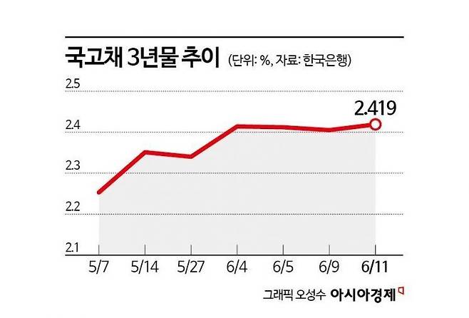 국고채 3년물 금리는 지난달 초만 하더라도 2.25% 수준이었는데 12일 기준 2.43%까지 상승했다. 이재명 정부가 2차 추가경정예산(추경) 편성 등 확장 재정에 나서면서 대규모 국채 발행 가능성이 커지자 국고채금리 상승 추세가 뚜렷해졌다. 김기명 한국투자증권 연구원은 "신정부 출범 후 확장적 재정 정책이 예상되면서 국채 장기물을 중심으로 금리 상승 압력을 받고 있다"며 "2차 추경이 35조원 이상의 슈퍼 추경으로 확대되고 해당 금액만큼 적자국채 발행이 우려되면서 국고 3년 금리가 2.4%대로 상승했다"고 설명했다.