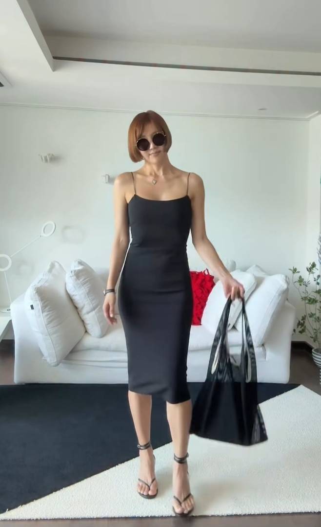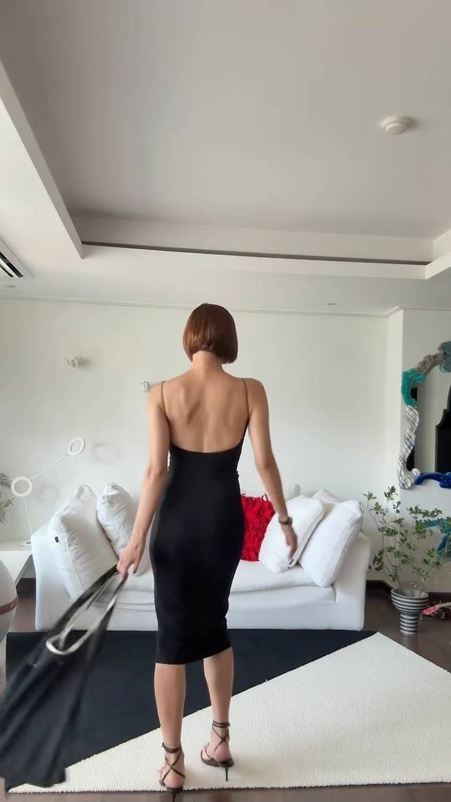 영상 속 그는 블랙 슬립 드레스를 입고 거실을 런웨이처럼 걸으며, 과감한 백리스 라인과 군더더기 없는 핏으로 시선을 압도했다.