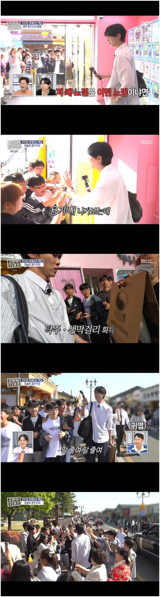 인파를 가로지르는 주우재에게 한 가게 직원은 “사장님이 드리라고 했다. 탁주랑 막걸리다”라며 선물했다. 주우재는 “선물 주셔서 너무 감사하다. 그런데 무겁다. 5kg이다”라고 말했다. 게다가 자신을 연신 신기하게 바라보며 말을 거는 학생들에게 주우재는 “너희 몇 살이냐. 그런데 말을 줄이자”라면서도 “수학여행 온 거냐. 역사 공부 많이 했냐. 이탈하면 안 되니까, 얼른 선생님 있는 데로 가라”라며 안전 수칙에 유의했다.