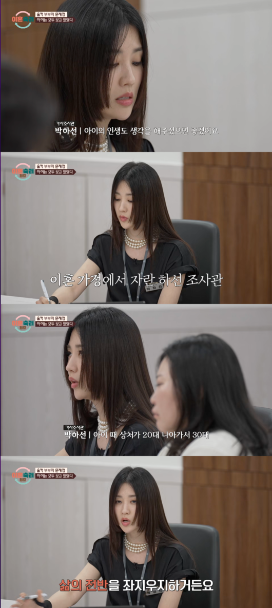 아이 앞에서도 쉬지않고 싸움을 하는 부부의 모습이 이어졌다. 박하선은 “아이의 인생도 생각을 해주셨으면 좋겠어요. 왜냐면 제가 누누이 말했지만 저는 이혼을 겪어본 입장에서는 아이 때 상처가 20대, 30대 나아가 삶의 전반을 좌지우지하거든요”라고 운을 뗐다. 박하선은 “아이의 인생도 한 번 생각해보셨으면 좋겠다”라며 진심을 담아 조언했다.