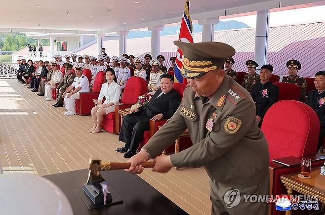 ( 평양 조선중앙통신=연합뉴스) 북한이 지난달 21일 진수식 도중 넘어져 좌초한 신형 5천t급 구축함을 수리해 진수식을 했다. 조선중앙통신은 13일 "조선인민군해군 구축함 진수기념식이 6월 12일에 라진조선소에서 진행됐다"고 보도했다. 노동당 중앙군사위원회의 명령에 따라 이 함정의 함급은 지난 4월 진수한 '최현급'이라고 밝혀 5천t급 구축함임을 확인했고 함명은 '강건호'로 명명됐다. 2025.6.13