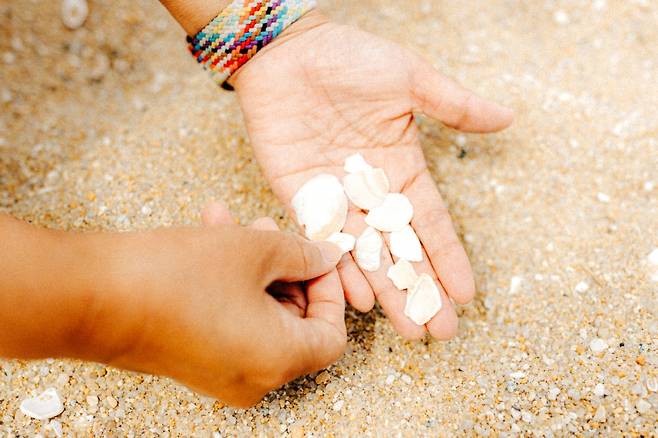 바다에도 업사이클링을 위한 재료가 적지 않았다. 해변 곳곳에 박혀 있는 씨글라스나 조개껍데기가 그것이다. 피크닉 매트에서 일어나 해변을 천천히 걸으며, 업사이클링에 필요한 재료 수집에 나섰다. 모래사장은 폭신했다. 발이 쑥 빠지기도 했다. 바닷가 산책은 '맨발이 제격'이라며, 슬리퍼를 손에 들고 맨발로 바다에 들어갔다. 차가운 물이 발에 닿자, 어두운 밤에 불이 켜지듯 몸이 환하게 밝아졌다.