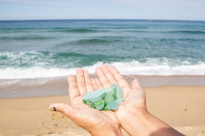 산책을 시작할 때만 해도 비어 있던 주머니가 솔방울과 씨글라스, 조개껍데기로 가득 찼다. 에메랄드빛의 씨글라스는 바다 쓰레기의 한 종류다. 인류가 내다 버린 유리병이 오랜 시간 깨지고 부서져 작은 조각으로 남은 것. 속초의 로컬 공방, '솔아스토리'에서는 바다에서 나온 씨글라스로 디퓨저를 만들 수 있는 간단한 체험을 제공한다.