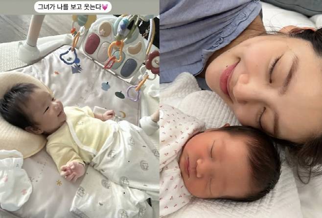 손담비는 "그녀가 나를 보고 웃는다"라며 엄마를 보면서 귀여운 미소를 짓는 딸 해이를 자랑했다.