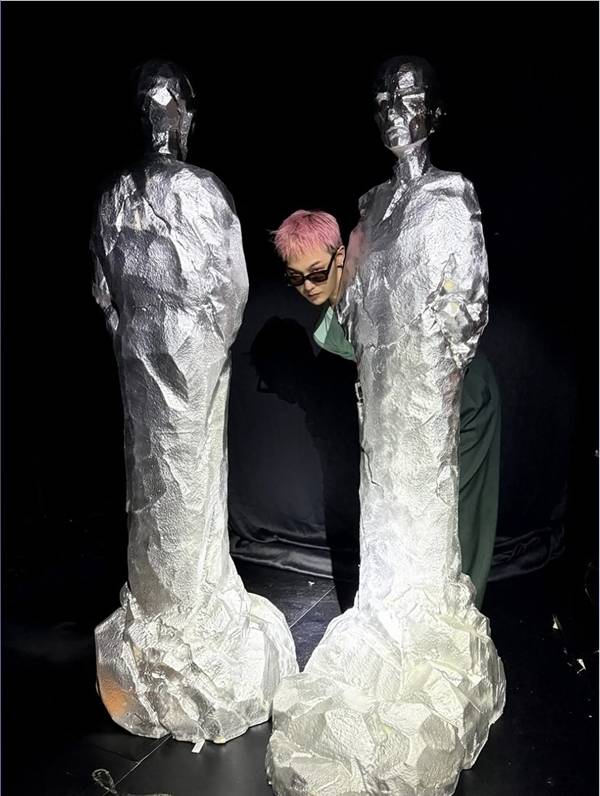 사진 속 그는 엘리베이터 안에서 뾰족하게 뻗친 헤어와 글래머러스한 플라워 재킷, 진주 목걸이를 매치해 클래식과 위트를 동시에 담은 룩을 선보였다. 또 다른 사진에서는 두 개의 은박 인체 조형물 사이에 들어가 고개를 내밀며 일종의 ‘관찰자 혹은 피사체’처럼 자신을 배치했다.