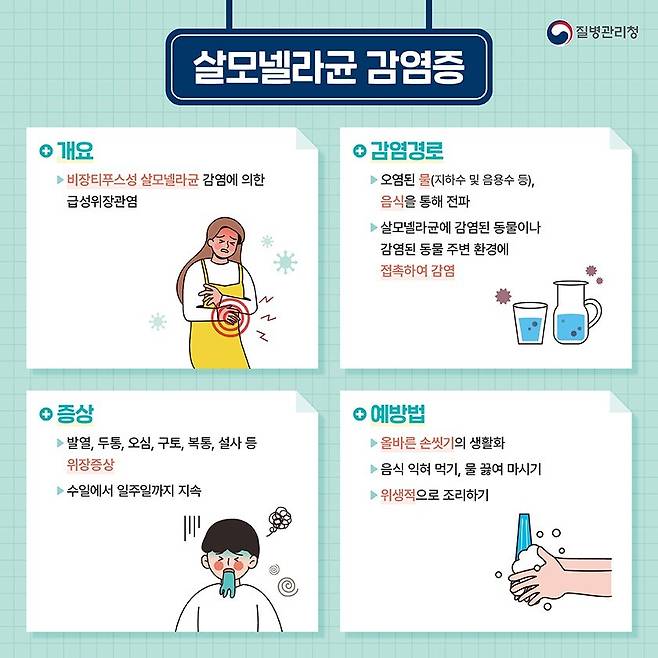 살모넬라균 감염증은 오염된 음식 섭취를 통해 발생하며, 주로 덜 익힌 달걀, 가금류를 통한 전파가 많기 때문에 조리 시에는 중심온도 75℃가 1분 이상 되도록 충분히 익혀먹어야 한다. 또 달걀을 만진 뒤에는 세정제를 이용해 손을 깨끗이 씻고 위생적으로 조리해야 한다.