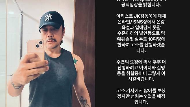 지난 12일 JK 김동욱은 개인 계정에 소속사의 공식 입장문과 함께 "온라인 상에서 아티스트 JK김동욱에 대해 온갖 욕설과 입에 담지 못할 수준 이하의 발언으로 명예를 훼손한 10여 명에 대해 고소를 진행할 예정"이라고 밝혔다.