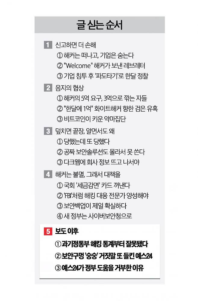 아시아경제는 5월26일부터 6월1일까지 해킹을 당해도 신고를 안 하는 기업들을 추적한 '은폐' 시리즈를 보도했다. 시작은 넉 달 전 과기정통부 출신 고위 공무원에게 들은 한마디였다. "해킹을 당하면 신고는 안 하고 해커에게 비트코인을 주는 기업이 태반이다. 평판은 나빠지고 정부는 네 탓만 하니 신고를 안 하는 거다."