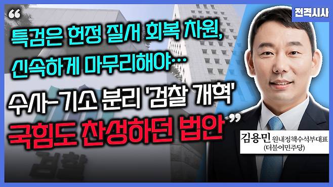 ▶ 김용민 : 일단 대통령 방탄 관련해서는 이미 기소 다 했는데 무슨 방탄입니까. 그거는 그러니까 그 정도로 국민의힘의 논리가 허술합니다. 그리고 수사, 기소 분리에 대해서 비판하는 국민의힘의 의원들은 진짜 자기 반성해야 됩니다. 왜냐하면 수사, 기소 분리법은 국민의힘 의원들도 상당수가 많이 기존에 냈습니다. 발의를 했습니다. 대표적으로 권성동 의원 수사, 기소 분리해야 된다 법안까지 냈던 분으로 제가 알고 있는데요. 그러니까 자당의 중진 의원들 주호영 의원도 냈던 것으로 제가 기억하고요. 자당의 주요 의원들 중진 의원들이 다 수사, 기소 분리 찬성했고 법안까지 냈는데 이제 진짜 가시화되니 갑자기 태도를 돌변하는 것입니다. 이건 그냥 정쟁용이죠.