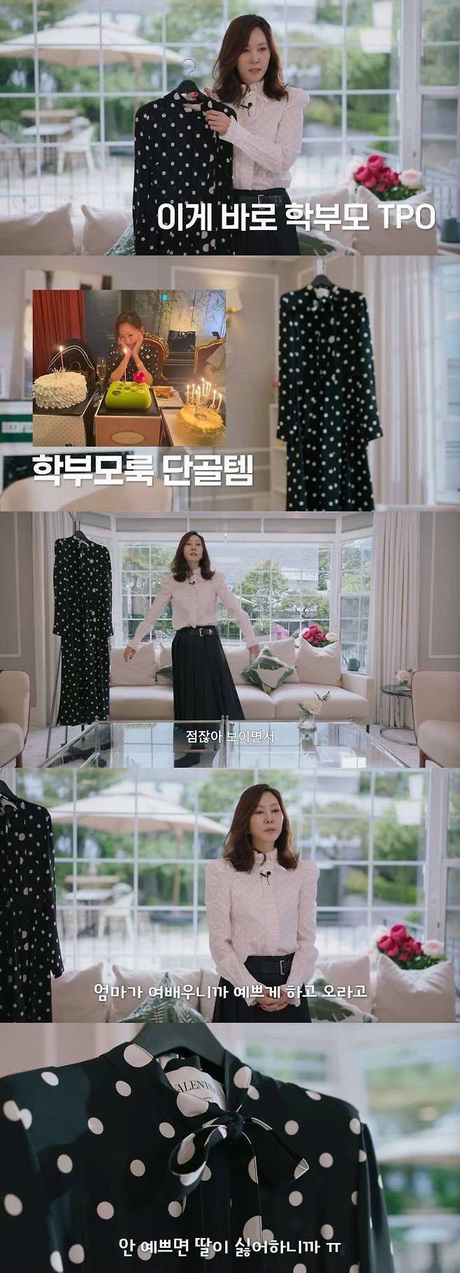 딸과 아들을 둔 엄마 김남주는 명품 V사의 드레스를 꺼내며 "얘는 학부모룩이다. 해마다 옷이 똑같다. 매번 입진 않지만 항상 등장하는 아이다. 이거 입고 자켓 입어주면 격식있어 보인다"고 이야기했다.