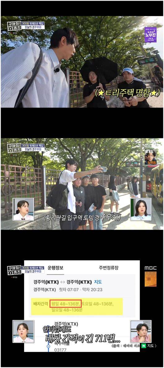 이렇게 돌아온 주우재는 뼈만 남았다. 김숙과 박나래는 “왜 이렇게 애가 말라비틀어졌냐”라며 놀랐고, 양세형은 “피가 증발한 애 같다”, “미이라가 온 줄 알았다”라고 말했다. 그럴만 한 게, 주우재는 배차 간격이 무려 최대 136분 짜리 시내 버스를 타느라 곤죽이 됐던 것이었다.