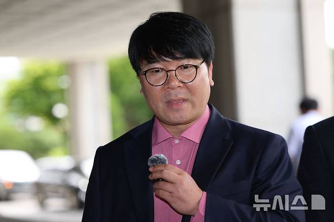 [서울=뉴시스] 황준선 기자 = 윤석열 전 대통령 부인 김건희 여사와 제삼자의 대화를 녹음한 혐의를 받는 서울의소리 이명수 기자가 13일 서울 서초구 서울중앙지방검찰청에서 열린 소환 조사에 출석하며 취재진의 질문에 답변하고 있다. 2025.06.13. hwang@newsis.com