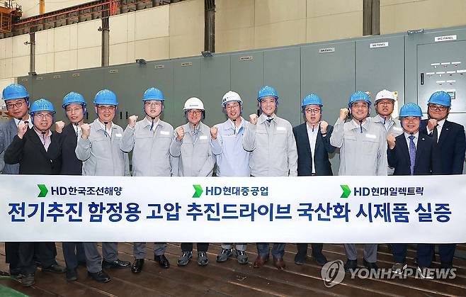(서울=연합뉴스) HD현대가 모듈형 구조(MMC)의 고압 추진 드라이브 제품 개발에 성공했다고 13일 밝혔다. 주원호 HD현대중공업 특수선 사업대표(왼쪽 다섯 번째부터), 설승기 HD현대 기술자문, 김영기 HD현대일렉트릭 대표, 김성준 HD한국조선해양 대표 등 참석자들과 기념 촬영하고 있다. 2025.6.13 [HD현대 제공. 재판매 및 DB 금지]