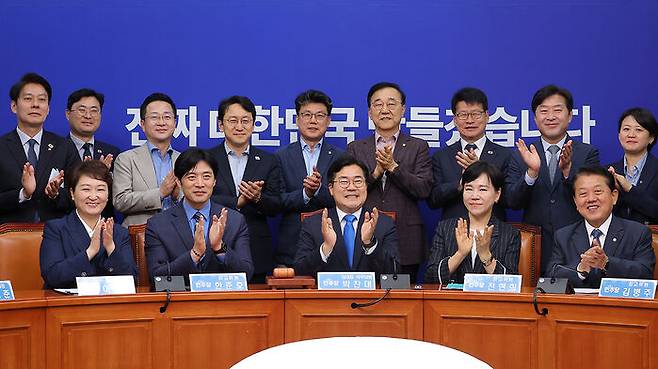 ▲ 더불어민주당 박찬대 당대표 직무대행 겸 원내대표가 13일 국회에서 열린 최고위원회의를 마친 뒤 손뼉 치고 있다.