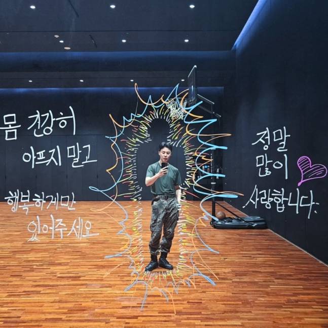 군 생활 중 받은 표창장 등 여러 상장과 부대원들에게 받은 롤링 페이퍼, 손편지, 추억이 담긴 사진까지 자랑한 지민은 같은 날 전역한 정국과의 사진도 게재했다.