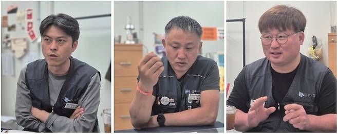 | ▲ 2025.05.17. <일터> 기획좌담에 참여중인 금속경기 노동안전보건활동가들의 모습(왼쪽부터 금속노조경기지부 김두형 노안국장, 말레동현화성지회 박종대 노안부장, 현대모비스안양지회 최수민 노안부장). 세 사람은 이구동성으로 강조했다. “노동자 참여가 실질적으로 보장돼야 위험 상황에 대한 능동적인 대처도 가능하다.” |