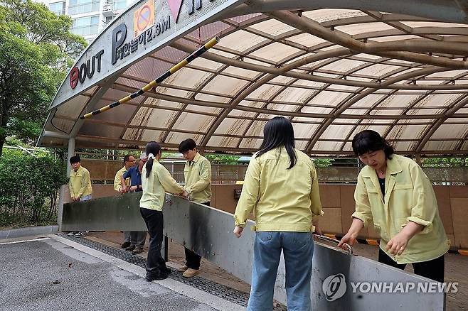 (광주=연합뉴스) 조남수 기자 = 13일 오전 광주 북구 용봉동 한 아파트 지하주차장 입구에서 북구청과 행정복지센터 직원들이 장마대비 차수막 설치 점검하고 있다. 2025.6.13