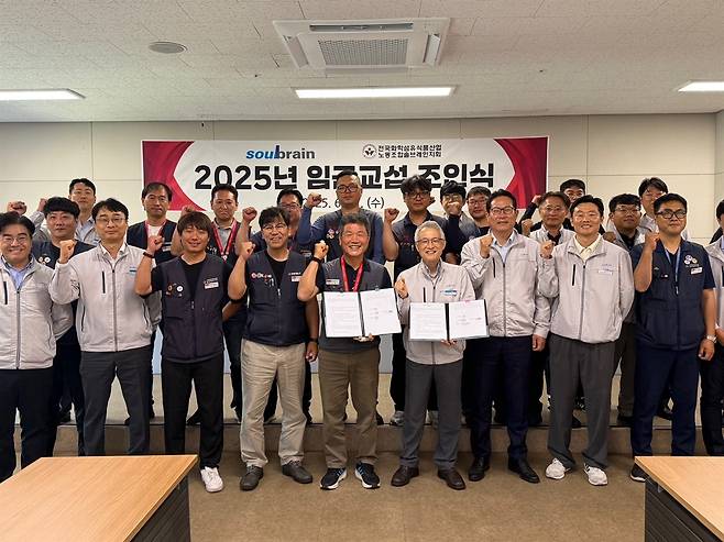 | ▲ 솔브레인 노사가 지난 11일 솔브레인 공주공장에서 2025년 임금교섭 조인식을 맺었다. |