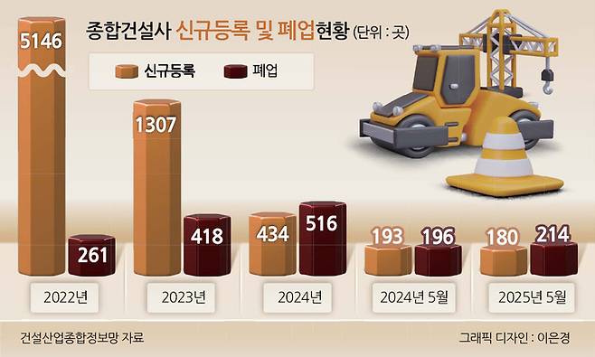 연도별 폐업 종합건설업체 수를 살펴보면 2022년 261곳→2023년 418곳→2024년 516곳으로 증가했는데, 5월에만 지난해 수치의 40%를 넘어선 만큼 올해에도 폐업 업체 수는 더욱 늘 것으로 보인다.