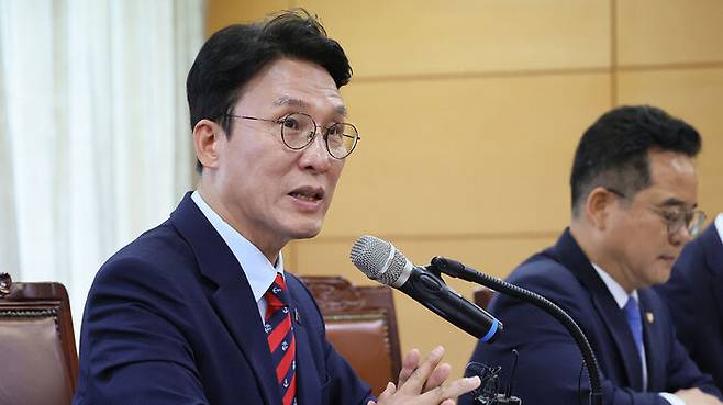 ▲ 김민석 국무총리 후보자가 13일 서울 종로구 통의동 금융감독연수원에 마련된 청문회 준비단 사무실에서 열린 밥상물가 안정을 위한 경청 간담회에서 발언하고 있다.