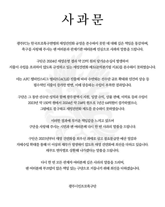 광주는 지난달 29일 사과문을 통해 "2024년 재정운영 결과 약 23억 원의 당기순손실이 발생하여 지출이 수입을 초과하지 않도록 규정하고 있는 재정건전화 제도(손익분기점 지표)를 준수하지 못했다. 이는 AFC 챔피언스리그 엘리트(ACLE) 진출에 따라 수반되는 선수단 규모 확대와 인건비 상승 등 필수적인 지출이 증가한 반면, 이에 상응하는 수입이 부족한 결과"라고 소명했다.