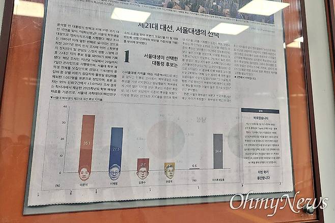 서울대 학보 <대학신문>이 지난 8일 발표한 정치의식조사 '대선 후보 지지율'에서 이준석(개혁신당 후보, 현 국회의원)은 35.1%로 가장 높은 지지를 얻었다(5월 14일부터 일주일간 학부생 1057명 온라인 조사). 이어 이재명(27.5% 더불어민주당 후보, 현 대통령), 김문수(7.7% 국민의힘 후보), 권영국(4.8% 민주노동당 후보) 순이었다. 24.4%는 지지 후보가 없다고 답했다.