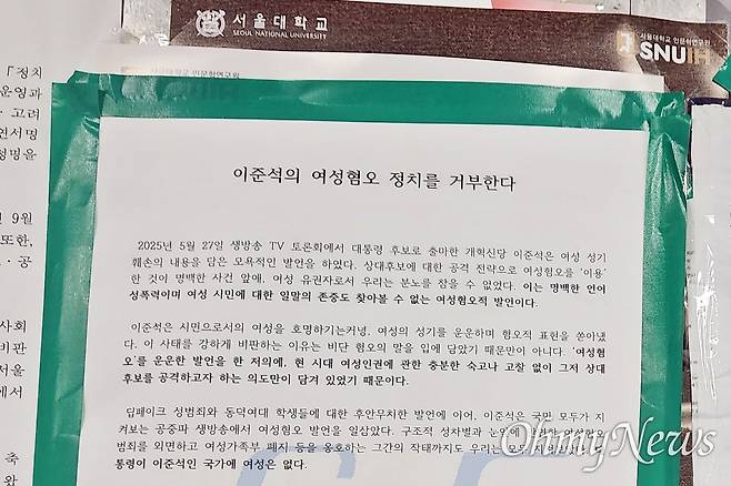 | ▲ 서울대학교 중앙도서관 터널에 이준석 대선 후보의 3차 TV토론 발언을 지적하는 대자보 등이 게시돼 있다. |