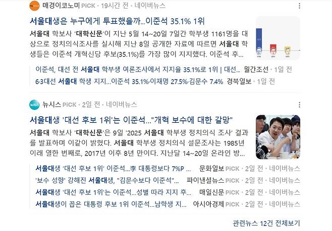| ▲ 서울대 학보 <대학신문>이 8일 발표한 '2025 서울대 학부생 정치의식조사'를 인용한 언론의 기사. 서울대 학생이 선택한 지지후보 1위가 이준석 개혁신당 대선 후보였다는 점이 강조돼 있다. |