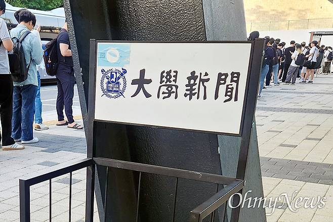 | ▲ 서울대학교 학생들이 셔틀버스를 타기 위해 줄을 서서 기다리고 있다. 줄 옆쪽 공간에 서울대학교 학보사 <대학신문>이 비치돼있다. |