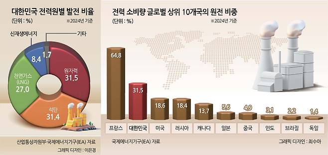 현재 글로벌 10대 전력 소비국 중 대한민국은 프랑스(64.8%)에 이어 31.5%로 원전 의존 비율 2위를 기록 중이다. 미국(18.6%), 러시아(18.4%), 캐나다(13.7%) 등에 비해서도 2배 가까이 높은 수준이다.
