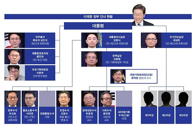 이재명 정부의 경제라인에는 전문가 그룹이 배치됐다. 이 대통령은 정책실장에 정통 엘리트 관료인 김용범 전 기획재정부 1차관, 경제성장수석에 하준경 한양대 경제학부 교수, 수석급으로 신설된 재정기획보좌관에는 류덕현 중앙대 경제학부 교수를 임명했다. 기획재정부의 경우 이형일 통계청장이 1차관을 맡게 된다. 이 청장은 대통령실 경제정책비서관, 기재부 경제정책국장·차관보, 미국 국제부흥개발은행(IBRD) 선임 이코노미스트를 지냈다. 2차관은 기재부 핵심 보직을 두루 거치며 예산 전문가로 평가받는 임기근 조달청장이 맡는다.