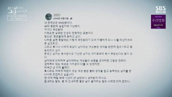 경제적 어려움이 한계에 다다르자 성병대의 분노도 마침내 폭발하게 돼. 그 무렵 그의 SNS에는 의미심장한 글들이 올라오기 시작해. 범행 8일 전 올린 글이야.