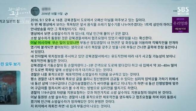 "경찰은 번동 병원에서 사망했습니다. 그분은 링거 주사제 치료 과정에서 독살됐을 가능성이 있으니까, 그 부분에 대해서 좀 알아봐 주셨으면 좋겠습니다."