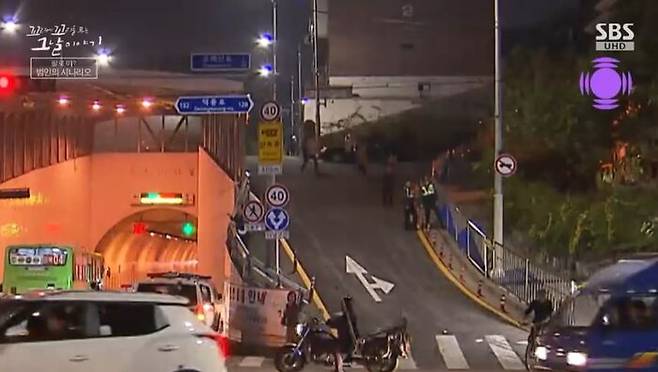 어느새 주위는 어두컴컴해졌어. 범인이 주택가 골목길을 나와 갑자기 막 뛰어서 찻길을 건너. 맞은편은 오패산 터널 입구야. 길을 건넌 범인은 터널 입구 오른쪽 경사진 길을 따라 올라가더니 화단 속으로 몸을 숨겨.