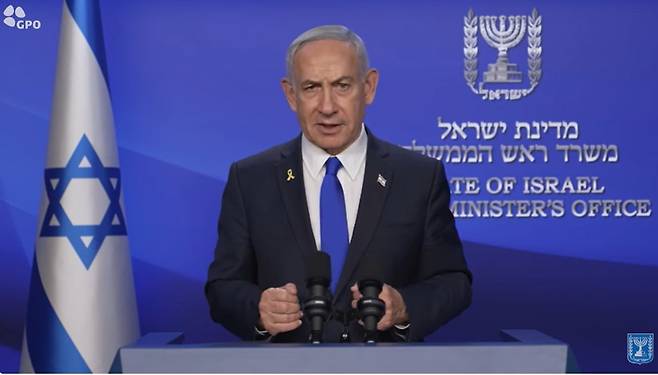 | ▲ 이스라엘 시각으로 13일 새벽 벤자민 네타냐후 이스라엘 총리가 이란 공습에 대한 섬명을 발표하고 있다. |