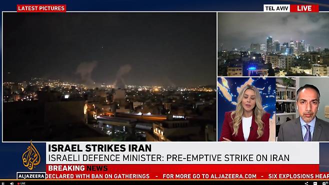 | ▲ 13일 오전 이스라엘 공군의 이란 테헤란 공습 소식을 전하는 <알자지라> 뉴스 방송 장면. |