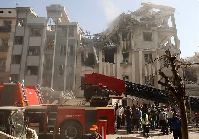 | ▲ 13일 이스라엘의 공습을 받은 이란 테헤란 북쪽 건물 밖에서 소방관들이 구조 작업 등을 벌이고 있다. |