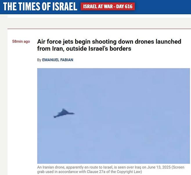 | ▲ <타임스 오브 이스라엘>은 13일 이란이 드론으로 보복공격을 하기 시작했고, 이스라엘 공군이 격추에 나섰다고 보도했다. |