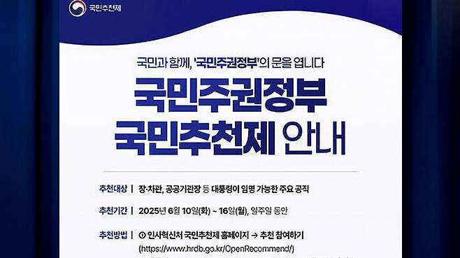 국민추천제는 이재명 정부가 장·차관 및 공공기관장 등 대통령이 임명할 수 있는 주요 공직 후보자를 오는 16일까지 일반인에게 추천받는 제도입니다.