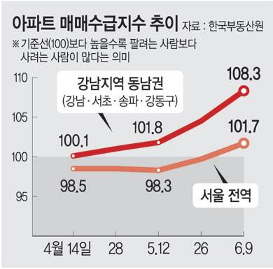 특히 동남권 매매수급지수는 9일 기준 108.3으로 서울 아파트 가격 폭등기였던 2021년(7월 26일 108.9) 이후 최고치다.