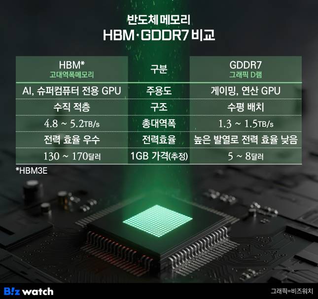 업계 한 관계자는 "HBM은 AI가속기 맞춤형으로 제작된 메모리고 GDDR7은 그래픽카드용 메모리기 때문에 AI 시장에서 GDDR7이 HBM을 완전히 대체한다고 보기는 어렵다"면서도 "AI가속기 훈련과 추론 등 일부 기능에서 HBM 대신 활용될 수 있다"고 설명했다.