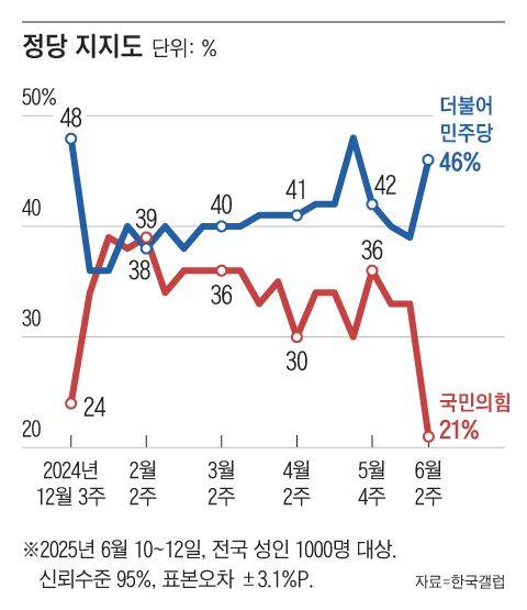 한국갤럽이 지난 10~12일 전국 성인 1000명을 대상으로 실시한 정당 지지도 조사(무선 전화 면접) 결과, 더불어민주당 46%, 국민의힘 21%, 개혁신당 5% 순이었다. 무당층은 21%였다.