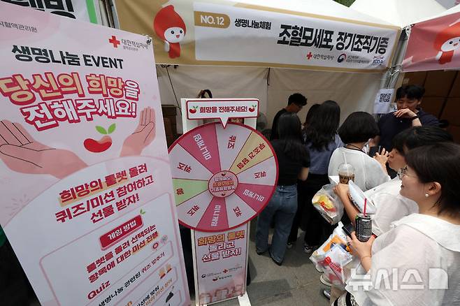[서울=뉴시스] 배훈식 기자 = 세계 헌혈자의 날을 하루 앞둔 13일 오후 서울 종로구 광화문광장에서 열린 2025년 헌혈자의 날 행사에서 시민들이 다양한 체험활동을 하고 있다. 이번 행사는 오는 15일까지 계속된다. 2025.06.13. dahora83@newsis.com